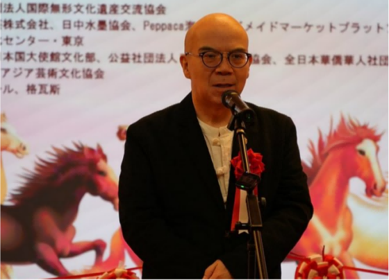 続いて、来賓として中国文化センターの羅玉泉センター長、水墨戲曲人物画家の李文培氏、日本中日水墨協会の満柏会長、中国変面芸術センターの王文強氏がそれぞれ挨拶。出展品の質と全体の演出に対する高い評価が相次ぎ、今回の展覧会は多様で深い非遺産芸術の魅力を生き生きと伝えるとともに、伝承者の文化ルーツへの揺るぎない継承と革新を強調。国際的な無形文化遺産交流のための確固たるプラットフォームを創出すると認識を共有した。